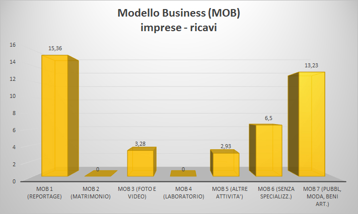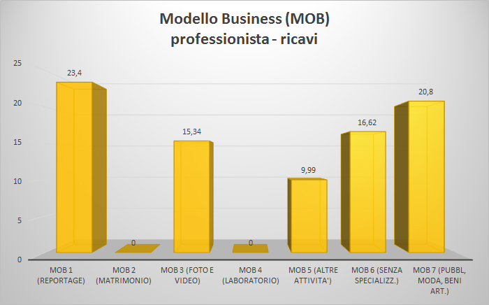 Fra i diversi dati, si parla del "MOB", che sta per MOdelli di Business: di fatto, una classificazione statistica che accorpa i diversi "modi" di essere fotografi e - sempre procedendo dalle statistiche rilevate dalle dichiarazioni raccolte - attribuisce dei valori di "aspettativa" diversi sul reddito dichiarato.
