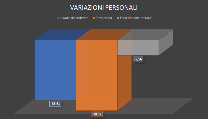 Per il collega che, da pensionato, esercitasse attività libero professionale, l'aspettativa in termini di compensi scende del 39,59%, mentre in termini di valore aggiunto scende del 52,5%