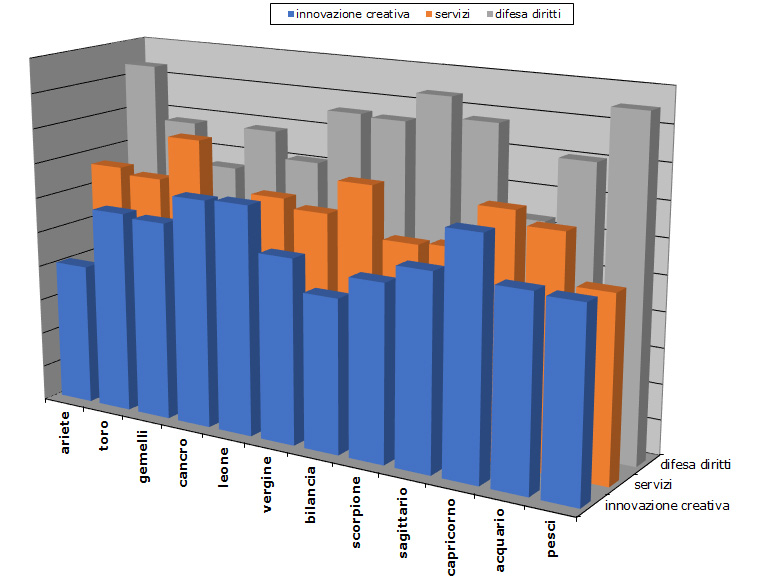 I piu' "conservatori" sono i colleghi dei Pesci, che richiedono quasi per la meta' (46,74%) innanzitutto la difesa dei diritti e della professionalita', accompagnati dai colleghi dell'Ariete.